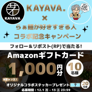 このたび「KAYAVA.総本店」では、SNS総フォロワー数40万人超の人気インフルエンサー「らぁ麺が好きすぎる人」とのコラボ企画『KAYAVA.×らぁ麺が好きすぎる人WEEK』を12月1日(月)~12月13日(土)に開催いたします。