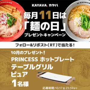 「KAYAVA.総本店」では、公式X・公式Instagram において毎月11 日「麺の日」に合わせ、『SNS プレゼントキャンペーン』を開催しております。10 月は、公式X において「PRINCESS ホットプレート テーブルグリルピュア」を1名様に、公式 Instagram において「真空遮断ボトル 16oz」を 3名様にプレゼントいたします。ぜひ、この機会にご応募ください。
